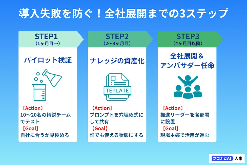 ライセンスを購入して配布するだけでは、AIの利用率は上がりません。以下のステップで段階的に定着を図ります。