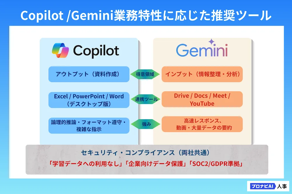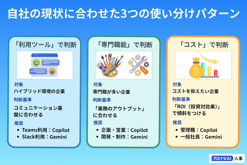 動画解析や画像認識が必要な場合もGeminiが有利です。一方、PowerPointでの資料作成頻度が高い企画職にはCopilotを優先的に付与するなど、「職能」でツールを割り振るのがROIを高めるポイントです。