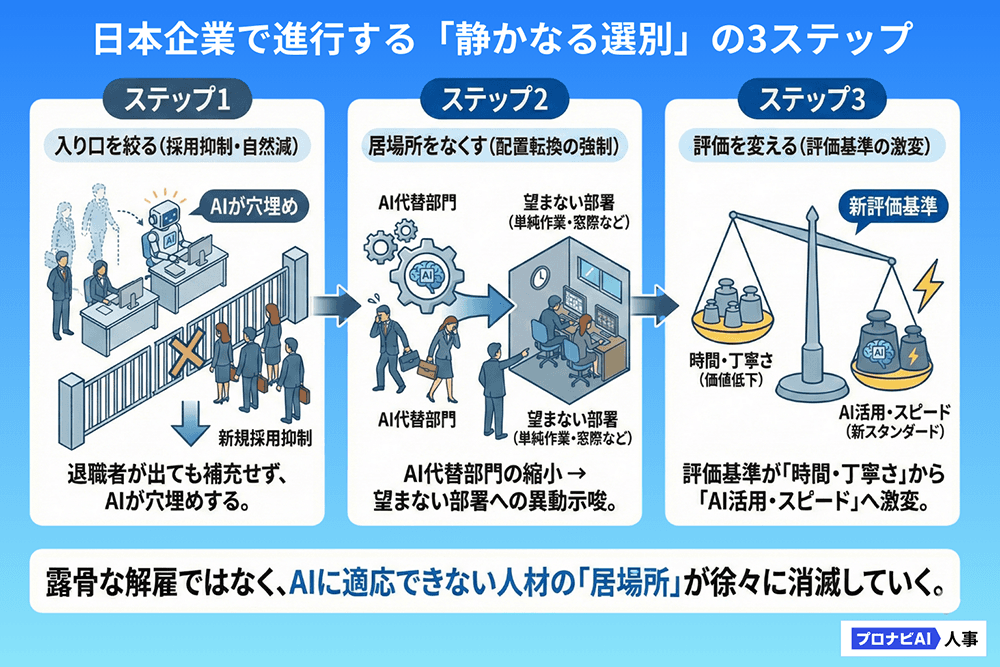これは、「雇用を守る」ことを美徳としてきた日本企業のスタンスが、AIという黒船によって変わりつつあることを示唆しています。 今後は、欧米のような露骨な解雇(レイオフ)ではなく、以下のような「静かなる選別」が進むと考えられます。