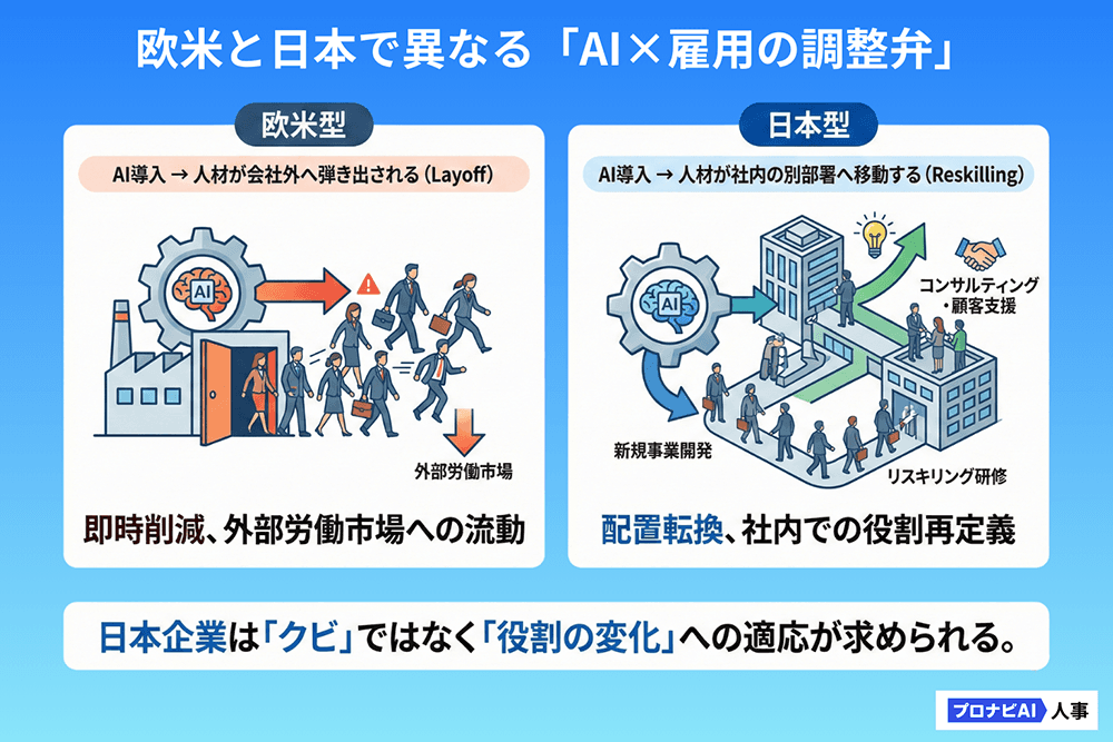 欧米企業では「AI導入=即人員削減」という判断が下されやすい一方で、解雇規制が厳しい日本では事情が異なります。多くの日本企業で起きているのは、「単純な削減(リストラ)」ではなく、「人材の再配置(リスキリング)」です。
