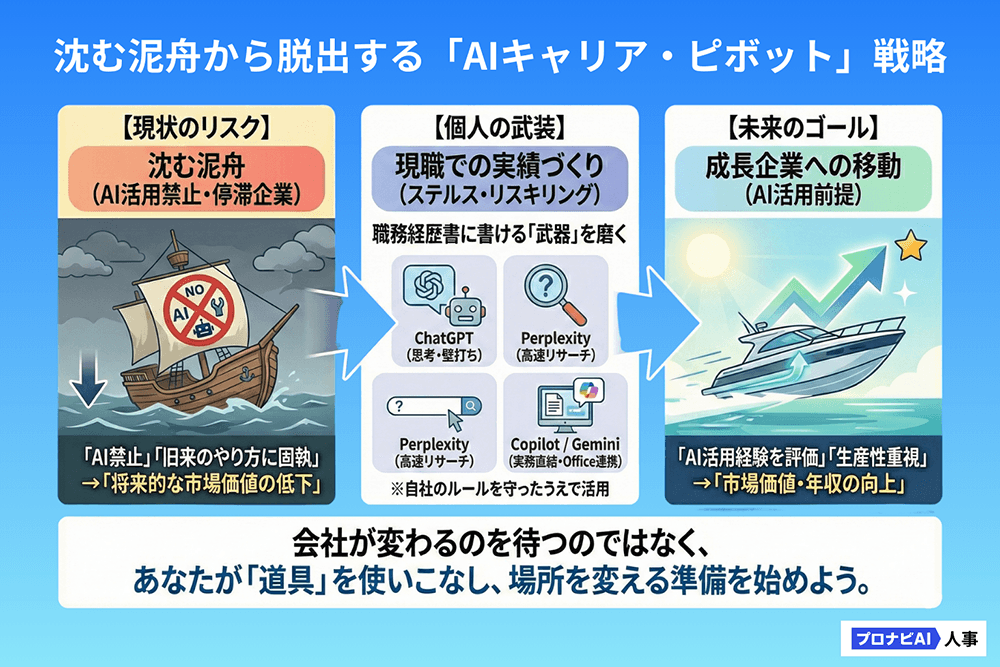 転職市場ではすでに、「AIツールを業務で活用した経験」が評価され始めており、「AIを使って業務効率化を進めた経験」は、職務経歴書において非常に強力なアピールポイントになります。現職にいる間に、自社のルールを守ったうえでAI活用の実績を積み重ね、それを武器にAI活用に前向きな成長企業へ移るという選択肢も、現実的な生存戦略の一つです。