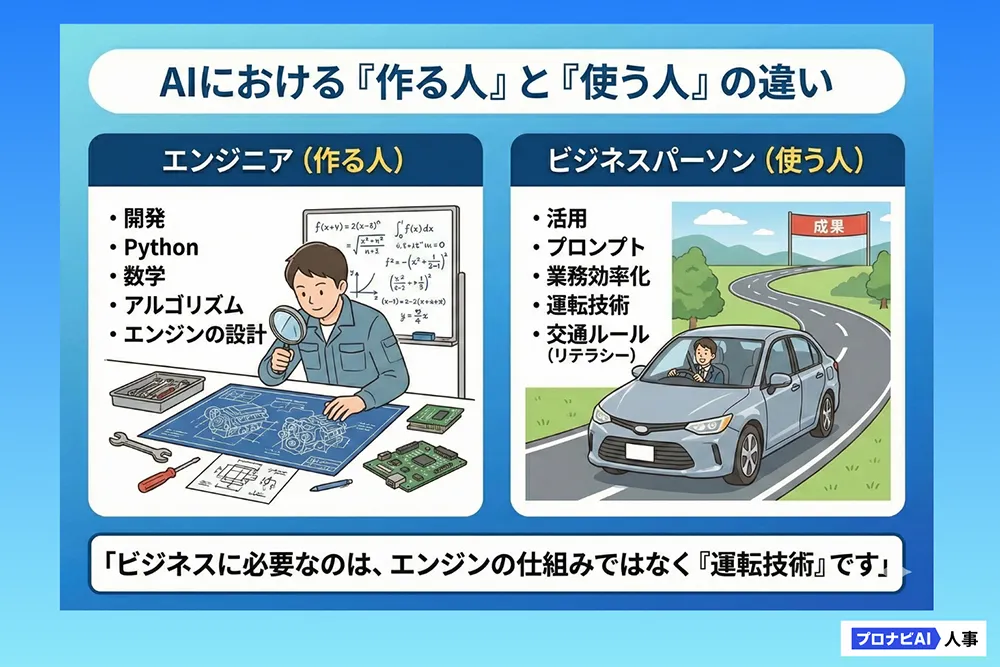 車を運転して、目的地(成果)へ向かう人。エンジンの構造を細かく知らなくても、ハンドル操作や交通ルールといった基本的なリテラシーを理解していれば十分。