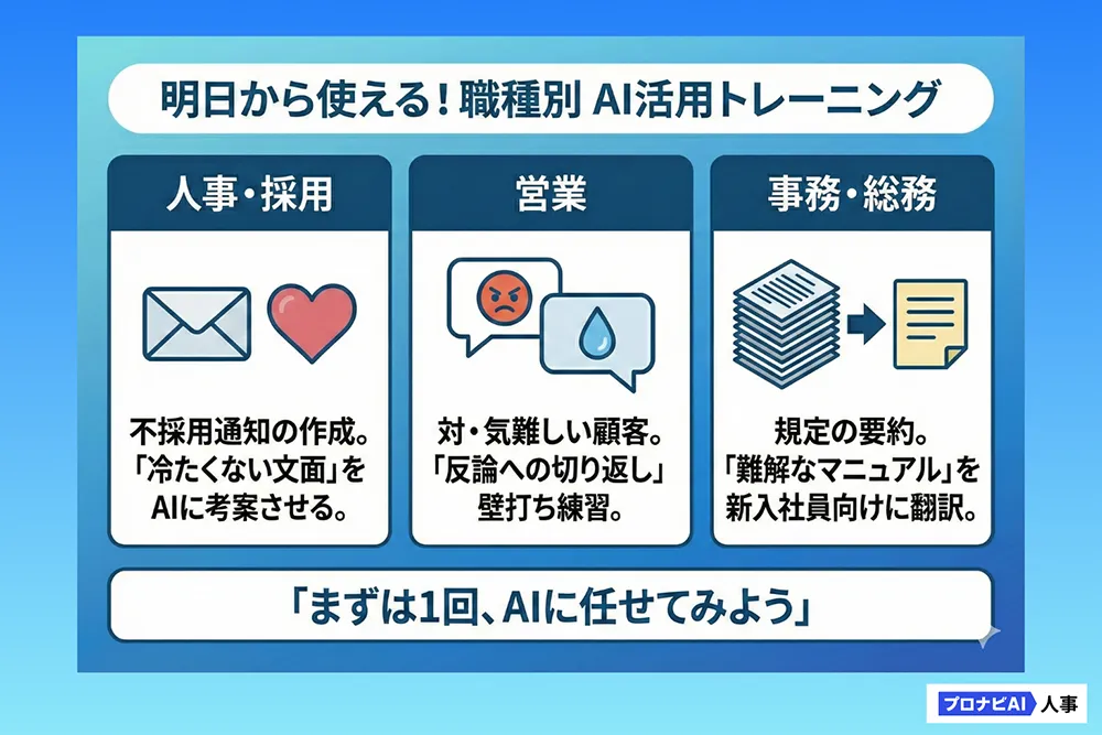 最後に、ご自身の職種に合わせてすぐ試せる、具体的なAI活用例を紹介します。
