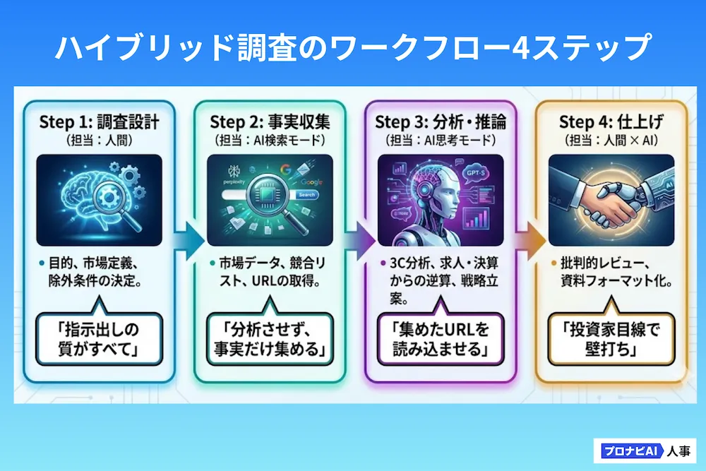 道具(ツール)が揃ったところで、次は実際にどのような手順で進めるか、全体像を確認しましょう。 本記事で推奨する「ハイブリッド調査」は、以下の4つの段階で進みます。この流れに沿って、AIのモードを切り替えていくことが成功のポイントです。
