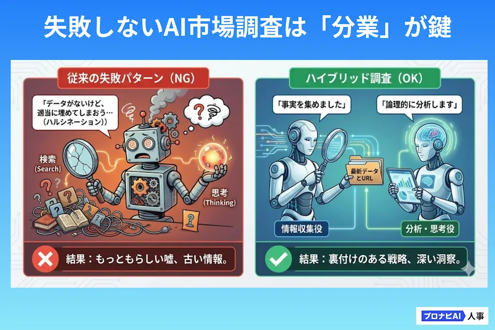- 「情報収集役」と「分析役」を分けるハイブリッド調査の考え方