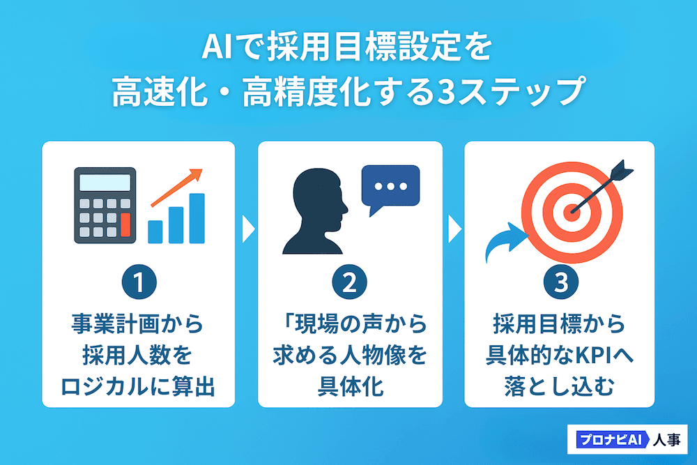 採用目標設定を速く・楽に・高精度に進めるには、AIの活用が効果的です。ここでは、具体的な3つのステップに沿って、その方法を解説します。