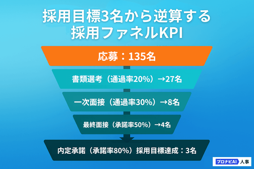 # あなたの役割 あなたは、データドリブンな採用コンサルタントです。 # 条件 - 採用目標人数:3名 - 過去の採用データに基づく歩留まり率: - 書類選考通過率:20% - 1次面接通過率:30% - 最終面接通過率:50% - 内定承諾率:80% # 指示 上記の条件で採用目標を達成するために必要な「内定者数」「最終面接実施数」「1次面接実施数」「書類選考通過数」「応募数」を、逆算して算出してください。計算過程も示してください。