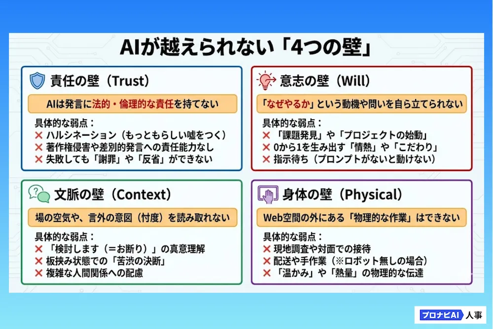 - AIができないこと(責任・倫理判断・動機づけなど)の具体的な限界