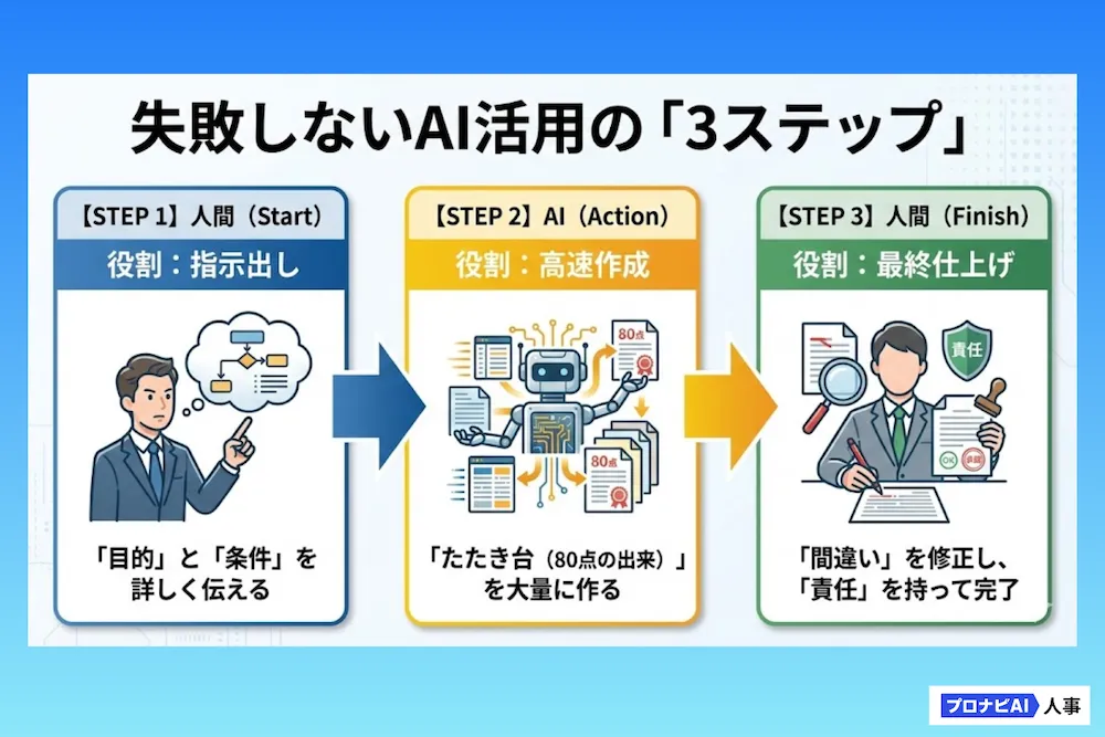 「間違いが許されない」業務が多いこの領域では、AIを「ダブルチェック役」や「たたき台作成役」として使うのが鉄則です。