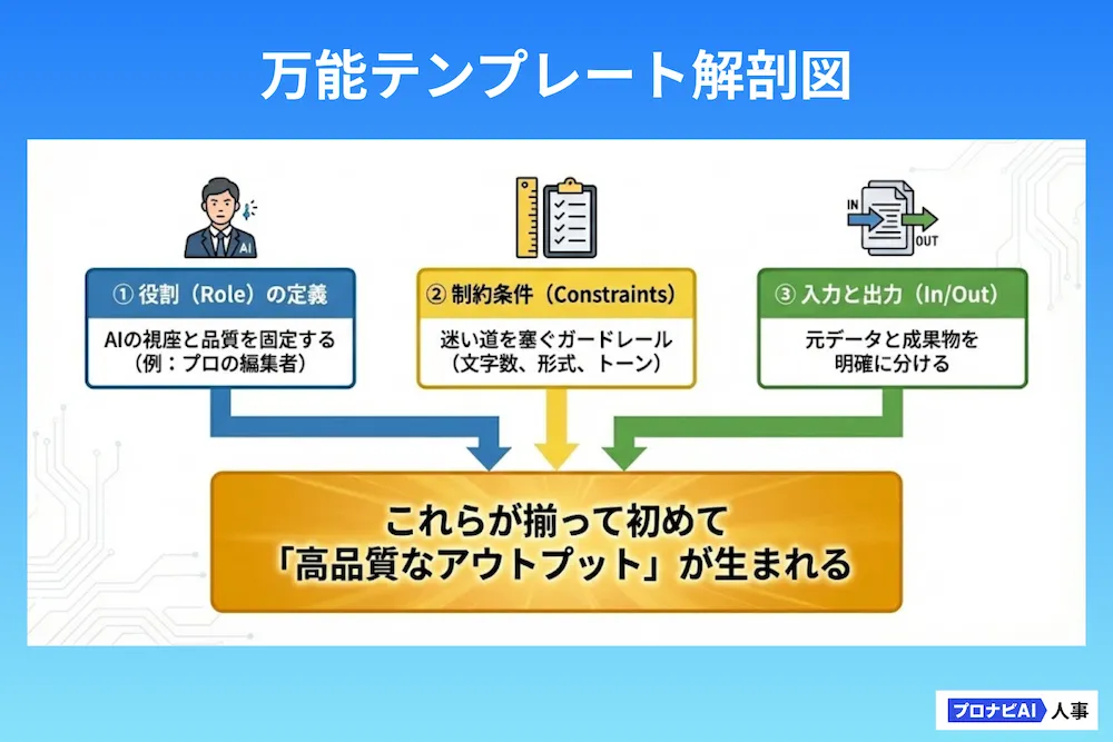 このテンプレートには、AIの性能を最大限に引き出すための「3つの必須要素」が含まれています。