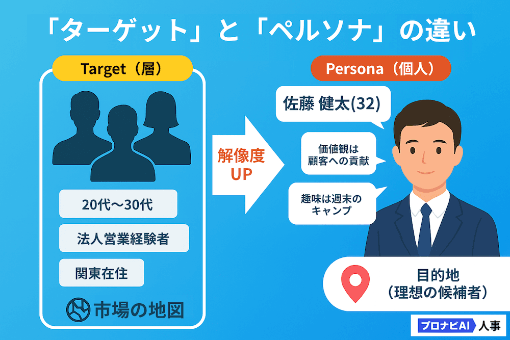 一方でターゲットは「20代後半から30代前半の法人営業経験者」といったような、特定の条件で括られた「集団・層」を指します。ターゲットが採用市場を大まかに捉えるための「地図」だとすれば、ペルソナはその地図の中から見つけ出したい、たった一人の人物を指し示す「目的地」といえるでしょう。この「個人」レベルまで解像度を上げることで、採用活動の精度が格段に向上します。