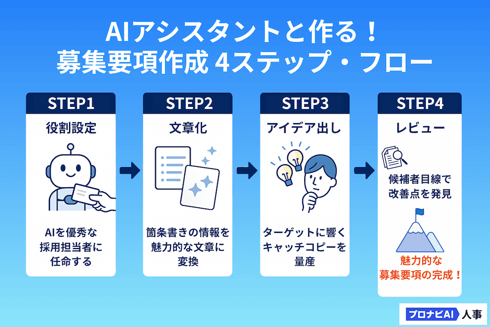 具体的にChatGPTを使って募集要項を作成する4つのステップを、そのまま使えるプロンプトとともにご紹介します。
