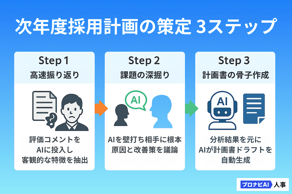 ここからは、実際にChatGPTを使って次年度採用計画を策定するための具体的な手順を、3つのステップに分けて解説します。紹介するプロンプトはコピー&ペーストして、自社の状況に合わせて[ ]の中身を書き換えるだけで使えます。