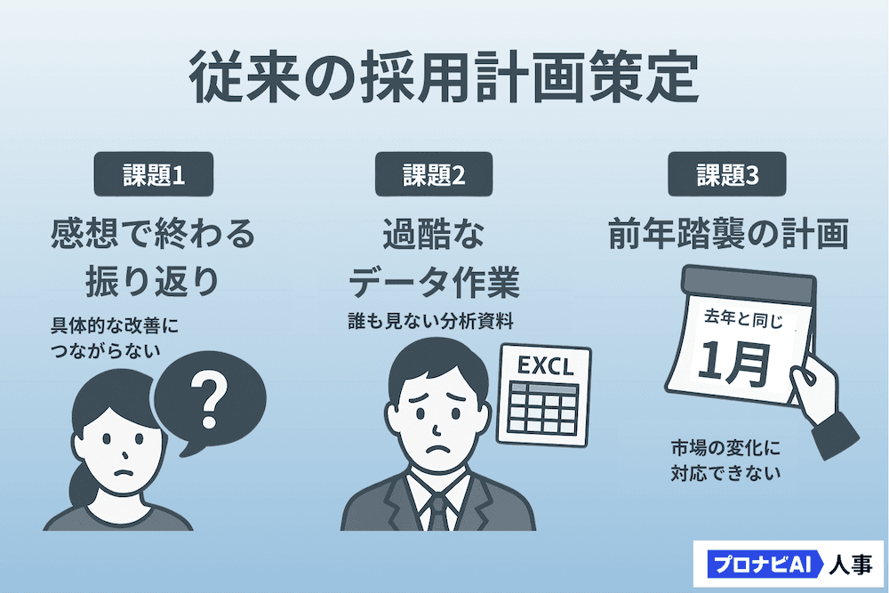 多くの企業で採用計画の策定は、多大な労力を要するにもかかわらず、その効果を十分に発揮できていないというジレンマを抱えています。その背景には、共通する3つの構造的な課題が存在します。
