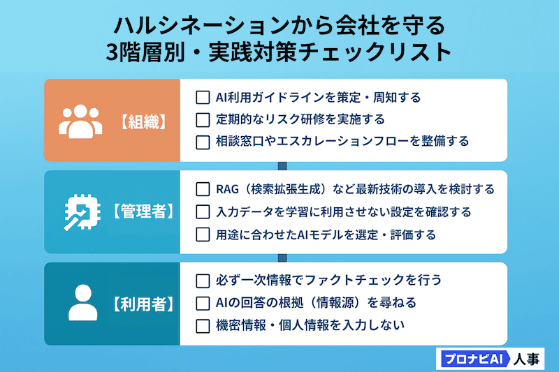 そもそも確率的であること、使う人のリテラシーに依存することから、ハルシネーションを100%なくすことは困難ですが、リスクを大幅に低減させることは可能です。ここでは「開発者・管理者」「利用者」「組織」の3つの視点から、具体的な対策を紹介します。
