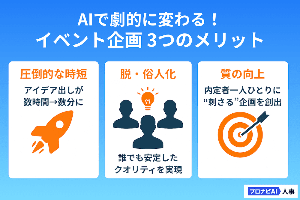 「AIというと、難しそう…」と感じる方もいるかもしれませんが、心配は不要です。ChatGPTなどの対話型AIは、専門知識がなくても直感的に使えるため、誰でもすぐに取り入れられます。内定者イベントの企画にAIを活用することには、主に以下の3つのメリットがあります。