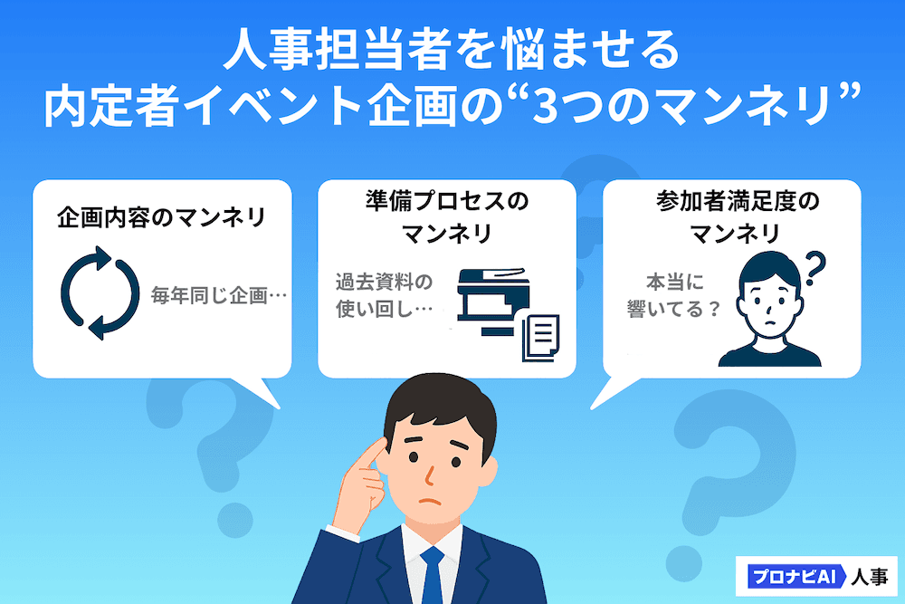 「今年も内定者イベントの季節か…」内定者イベントの企画が、毎年の悩みの種になっている人事担当者の方も多いのではないでしょうか。特にこの時期の企画業務は通常業務と並行して準備が必要となるため、大きな負担となりがちです。毎年同じような企画の繰り返しになってしまう、など以下のようなマンネリに陥っていないでしょうか。