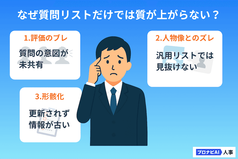 多くの企業では、基本的な質問リストは用意されているものの、その場の雰囲気で追加の質問をしたり、候補者の回答に対する深掘りの仕方が面接官ごとに異なったりします。その結果、候補者から引き出せる情報に差が生まれ、評価にバラつきが生じてしまうのです。