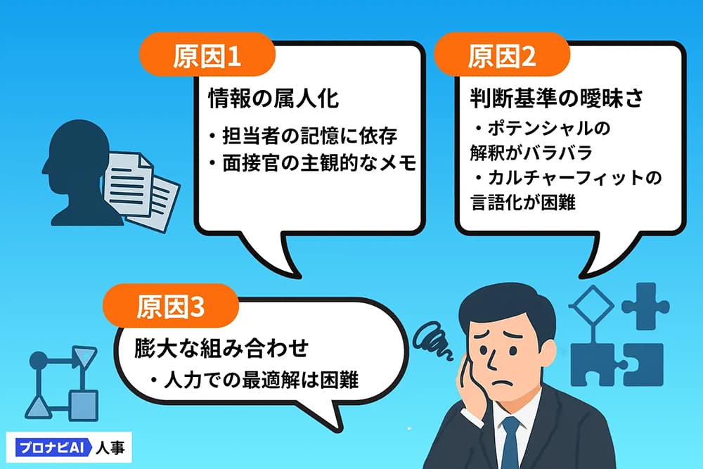 面接官のメモや研修担当者の所感、内定者面談の記憶など、重要な情報が、特定の担当者のPCや頭の中に散在しがちです。その結果、配属決定が担当者の主観や記憶に大きく依存してしまい、客観的な判断が難しくなります。 これが「情報の属人化」です。