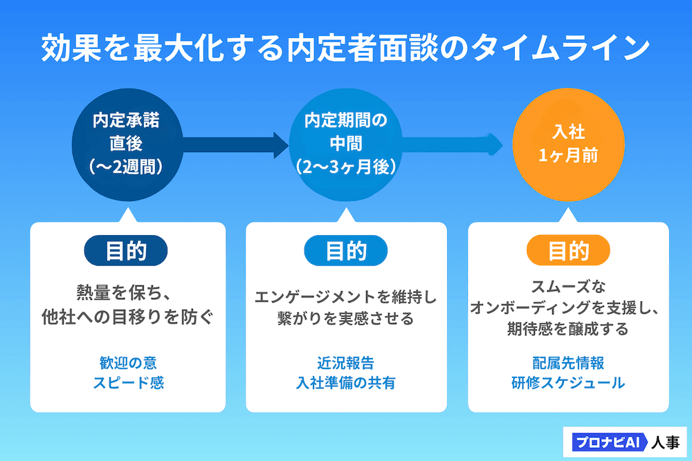 内定者面談は、実施するタイミングによってその目的と効果が異なります。内定期間を通じて、戦略的に複数の接点を設けることが理想的です。