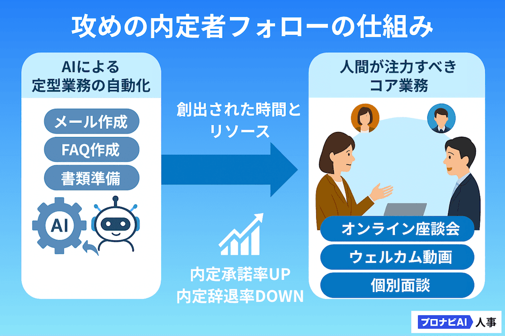 AIで事務作業を効率化して生まれた時間を、「人間だからこそできる、心のこもったフォロー」に使いましょう。これが、内定辞退を防ぎ、承諾率を高める「攻めの内定者フォロー」です。