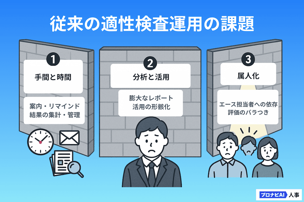 適性検査の運用担当者が直面しがちな課題は、大きく3つに集約されます。