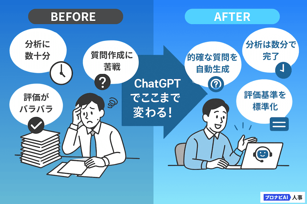 AIが生成した要約や質問リストを共通のフォーマットとして活用すれば、誰が担当しても一定水準の分析と面接準備ができるようになります。評価のバラつきを防ぎ、組織全体として採用の質を向上させることが可能です。