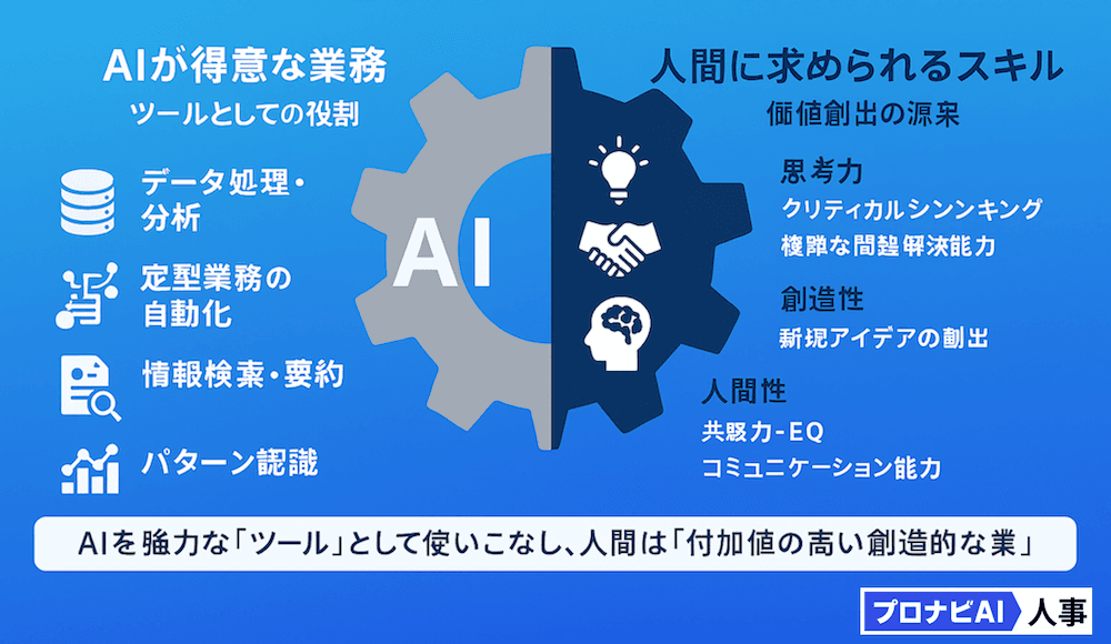 AIが普及する時代において、企業が求める人材像は大きく変化します。AIが苦手とする、人間特有の高度な能力がより一層重要視されるようになります。AIが定型業務を担うことで、人間はより創造的で、共感を伴う、戦略的な思考を要する業務に集中する必要があるためです。