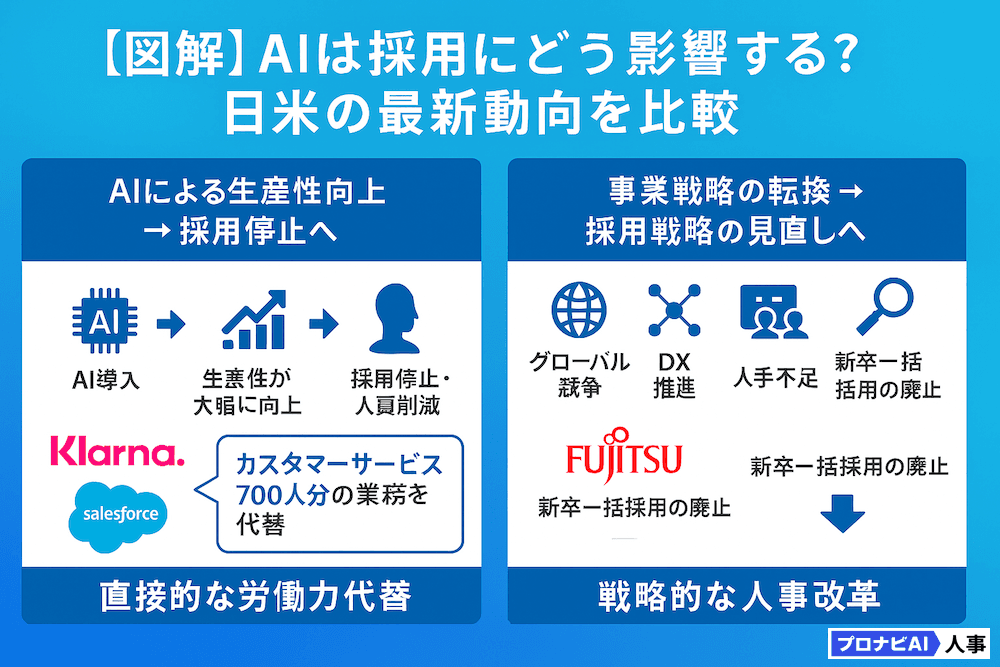 AIの労働市場への影響は、「採用停止」というよりは、むしろ「採用プロセスの変革」と「求められる人材像の変化」という形で顕在化しています。AIは、採用活動の効率化と迅速化に大きく貢献し、企業が求める人材の定義を再構築しています。
