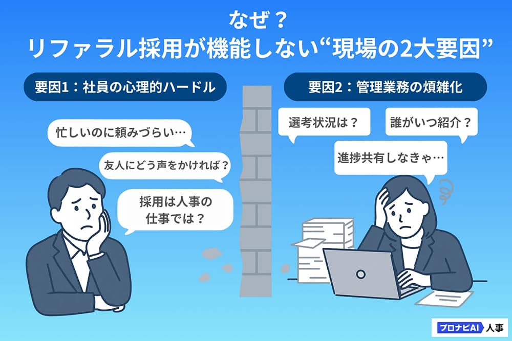 制度を整えても、リファラル採用が機能しない現場には共通した課題が存在します。それは、人事担当者の努力だけでは乗り越えがたい、構造的な問題です。