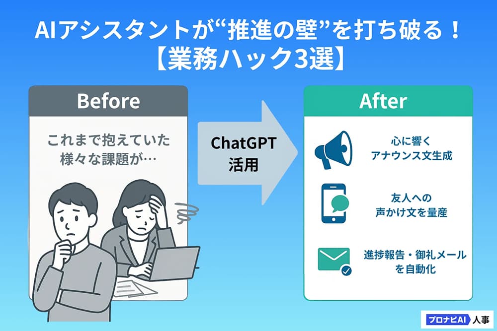 社員の心理的ハードルと、人事担当者の工数増大といった、2つの根深い課題は、生成AI(ChatGPTなど)を活用することで、劇的に改善できる可能性があります。 AIを“頼れるアシスタント”として活用し、推進業務を効率化・自動化する具体的な方法をご紹介します。