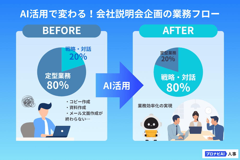 本記事では、会社説明会の企画に必要な基本ステップから、AIを活用した効率化の方法までを解説しました。会社説明会は候補者体験を大きく左右する重要な場です。しかし実際には、時間不足やマンネリ化、属人化といった課題が多くの現場で発生しています。こうした問題に対して、AIはアイデアを出す壁打ち相手や、定型業務を支援するアシスタントとして大きな力を発揮します。この記事で紹介したプロンプトをコピペすることからAI活用を始めてみて下さい。新しく生まれた時間を使って候補者一人ひとりと向き合う、より本質的な業務にシフトしていきましょう。