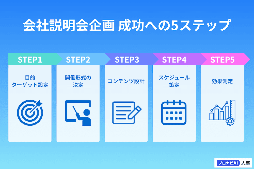 効果的な会社説明会を実現するためには、体系的な準備が欠かせません。ここでは、企画の土台となる基本的な5つのステップをご紹介します。