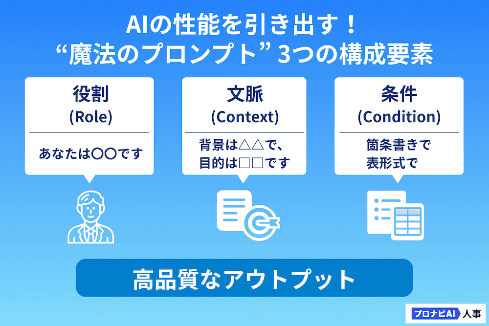 【プロンプト活用のヒント】AIからより良いアウトプットを得るためには、①役割を与える、②背景や文脈を伝える、③具体的な条件を指定する、という3点を意識して指示を出すことが重要です。