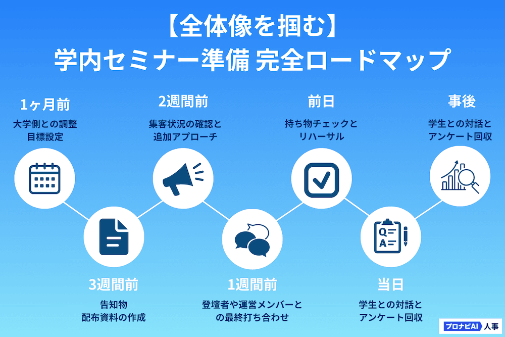 まずは学内セミナー準備の全体像を把握しましょう。ここでは、一般的な準備プロセスを7つのステップに分けて解説します。抜け漏れがないか、自社のプロセスと照らし合わせながら確認してみてください。