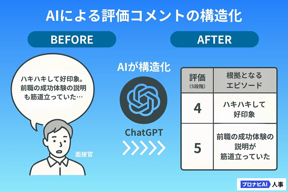 AIを使って、面接官の自由な感想を「評価項目」「5段階評価」「具体的なエピソード」といった構造化されたデータに変換します。これにより、客観的な比較やデータに基づいた採用判断が可能になります。