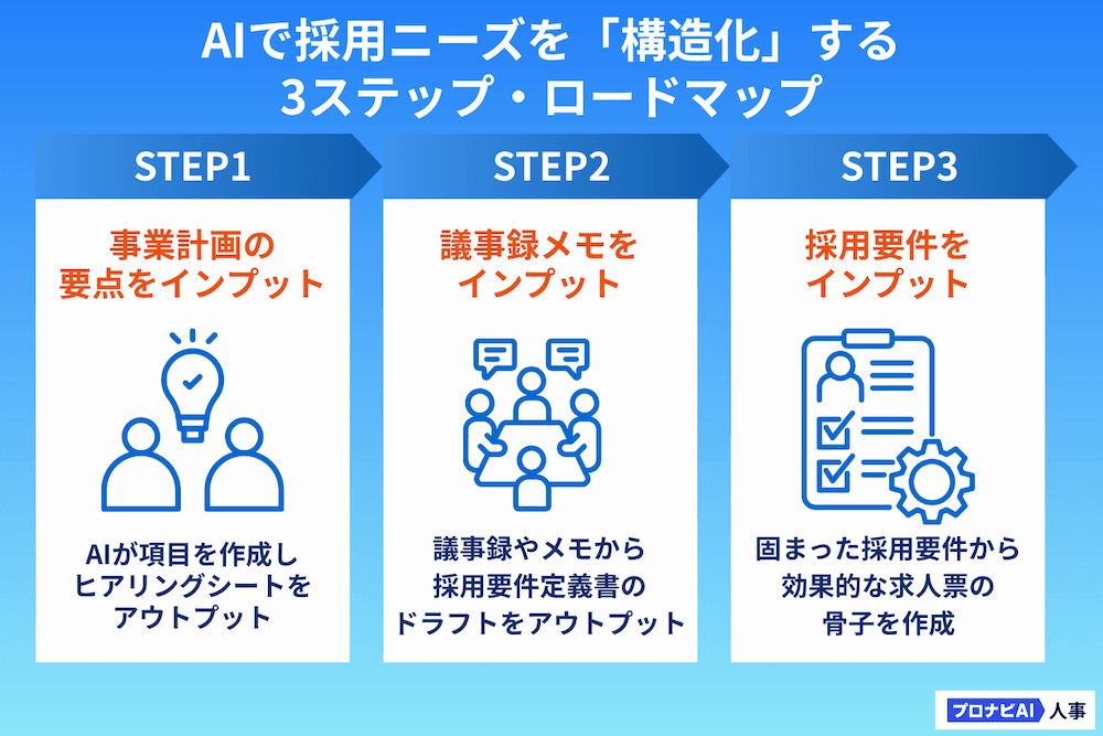 ここからは、無料でも利用できるChatGPTを使って、採用ニーズを具体的かつ構造的に把握するための3つのステップを、コピー&ペーストで使えるプロンプトと共に解説します。