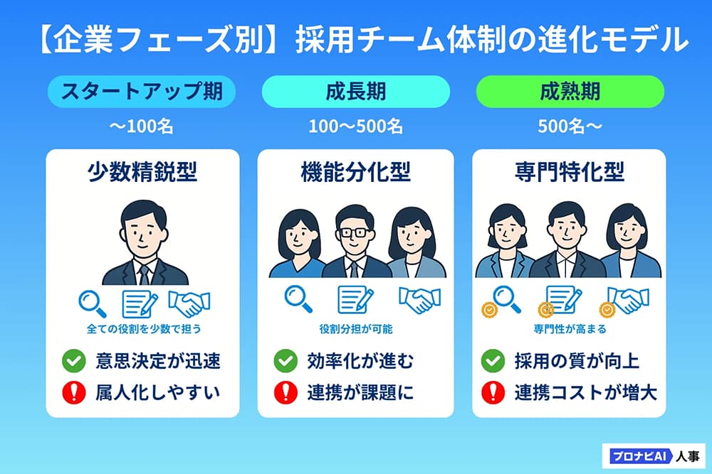 採用チームの理想的な形は、企業の成長フェーズによって変化します。ここでは代表的な3つのモデルを紹介します。