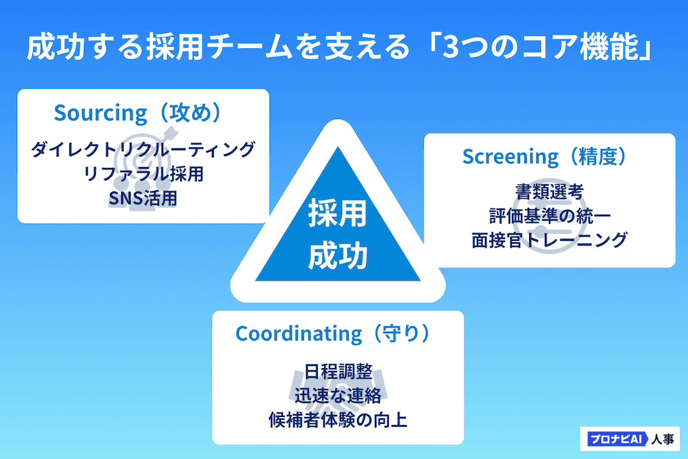 効果的な採用活動を行うチームには、企業の規模や業種に関わらず、共通して存在する3つの基本的な機能があります。自社のチームがこれらの機能を果たせているか、確認してみましょう。
