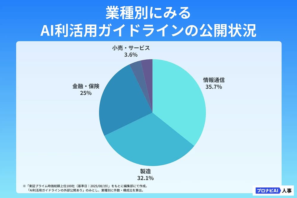 今回の調査(東証プライム上位企業+一次調査対象企業、2025年8月19日時点)では、AI利活用ガイドラインを公開している企業の業種分布に明確な傾向が見えてきました。