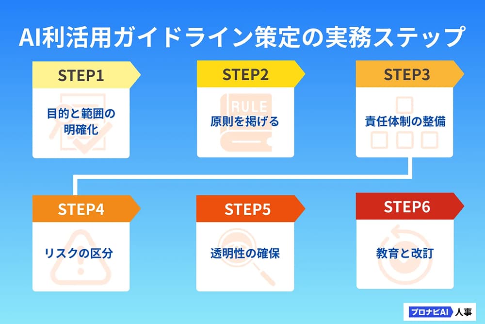 では、自社でAI利活用ガイドラインを作ろうとする場合、どのように進めればよいのでしょうか。国際的な原則を踏まえつつ、シンプルな流れを押さえれば、十分実効性のあるガイドラインを作ることが可能です。ここでは、策定のステップと、実際の現場で役立つアドバイスを見ていきましょう。