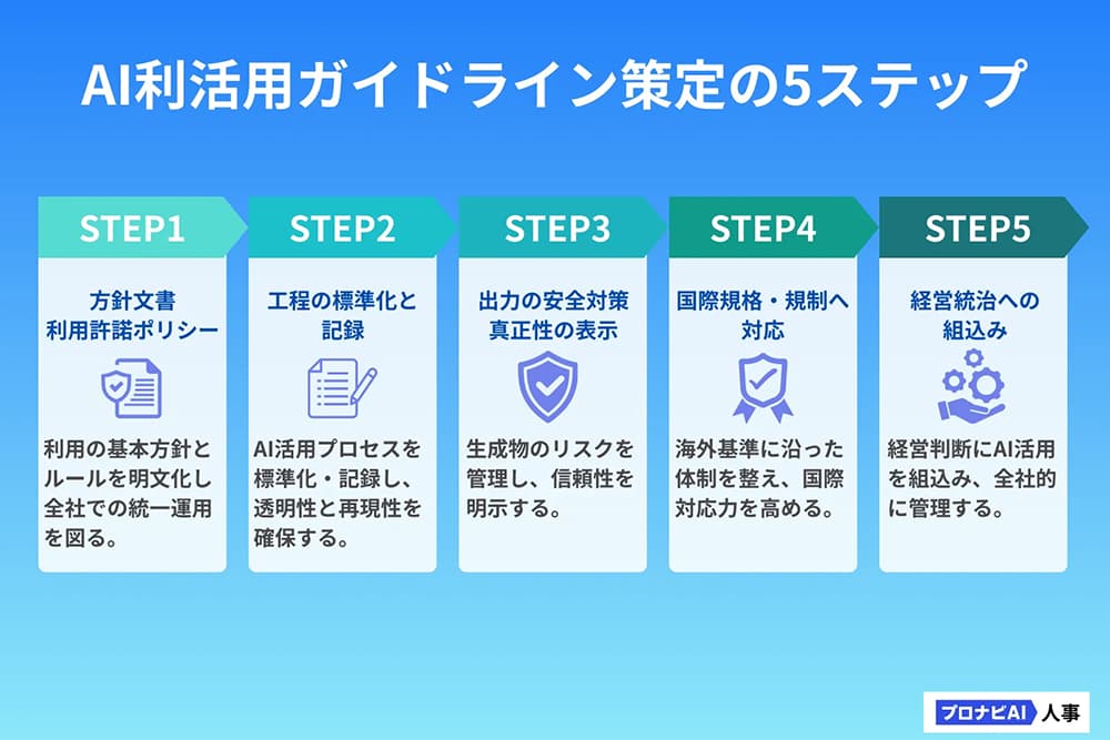 最短で運用できるAI利活用ガイドラインに着地させるためには、以下の5つのステップで段階的に整備していくのがおすすめです。