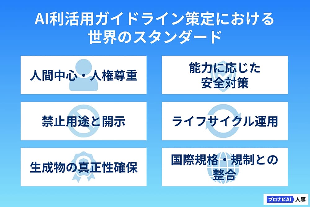 米国企業は「原則+具体的な運用方法+使用規約」を三位一体で提言、モデル能力の高度化に応じて定期改訂するのが特徴です。AIの導入から利用・管理まで、一連のプロセス全体で透明で、公平で、安全であることを徹底する点が共通しています。
