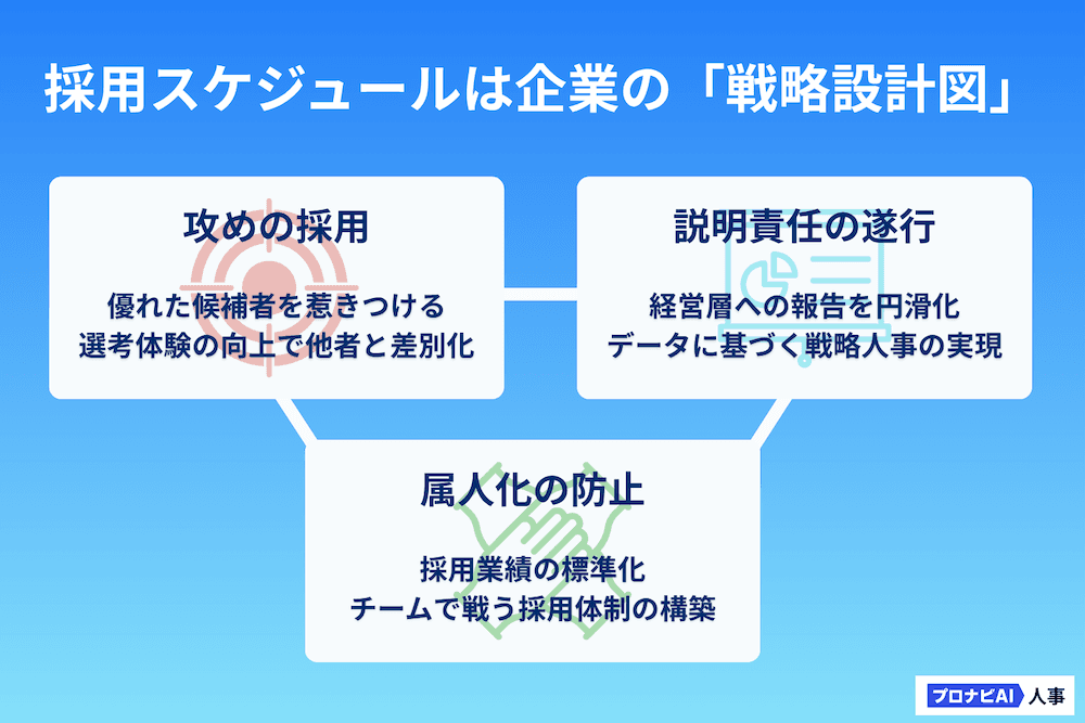 採用スケジュールは、単なる「日程表」ではありません。企業の採用活動全体の成否を左右する「戦略設計図」です。その作り方を見直すことには、3つの重要な理由があります。