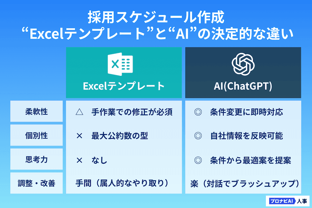 ChatGPTの強みは、単に情報を出力するだけでなく、与えられた条件に基づいて最適な答えを「思考」し、対話を通じて調整できる点にあります。まるで、優秀な採用アシスタントに壁打ち相手になってもらうかのように、スケジュールをゼロから構築・最適化できるのです。