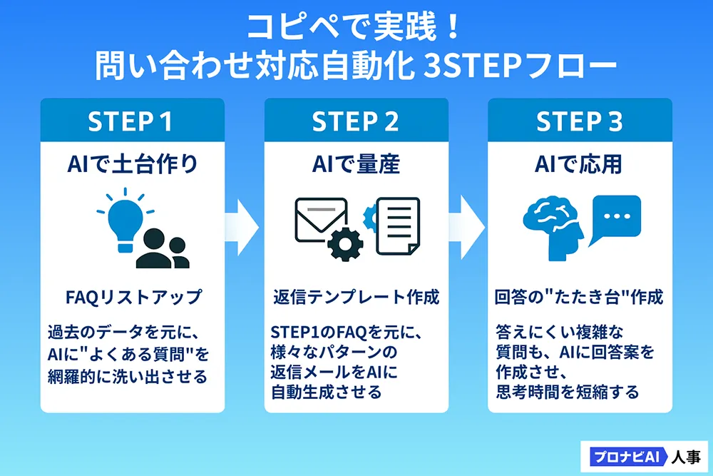 それでは、具体的にChatGPTを使って問い合わせ対応を効率化する方法を3つのステップで解説していきましょう。AI初心者の方でも迷わないよう、コピー&ペーストしてそのまま使えるプロンプト(AIへの指示文)と、その出力例を掲載します。