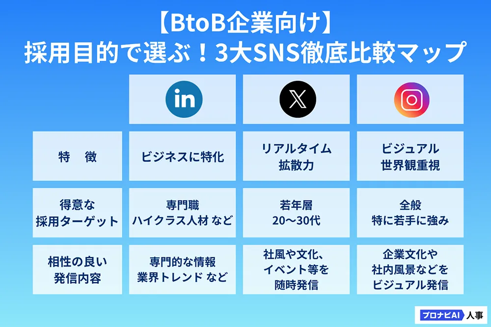具体的にどのSNSから始めるのが効果的なのでしょうか。BtoB企業が採用で活用すべき代表的な3つのSNSを比較し、最適な選択肢を考えます。