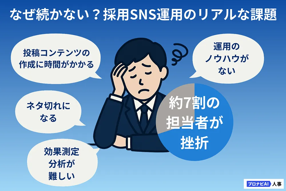 採用SNSの重要性は理解しつつも、多くの企業がその運用に苦戦しているのが実情です。ある調査では、SNS運用における課題として「投稿コンテンツの作成に時間がかかる」「運用のノウハウがない」といった点が上位に挙げられています。地道な手動運用だけでは、継続的な情報発信は難しく、成果が出る前に挫折してしまうケースが少なくありません。