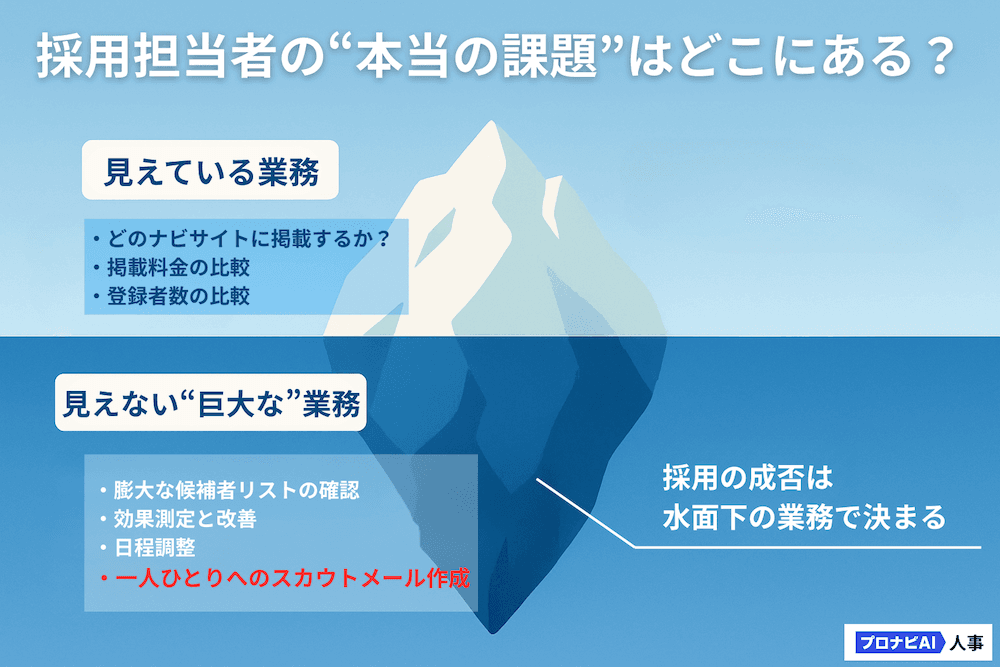 上記の比較表を見て、「よし、このサイトにしよう」と決めるのは、まだ早いかもしれません。なぜなら、どのサイトを選んだとしても、結局は「スカウト運用」の質と量が成果を左右するからです。むしろ、候補者が多い優良なサイトほど、スカウト業務の負担は増大する傾向にあります。