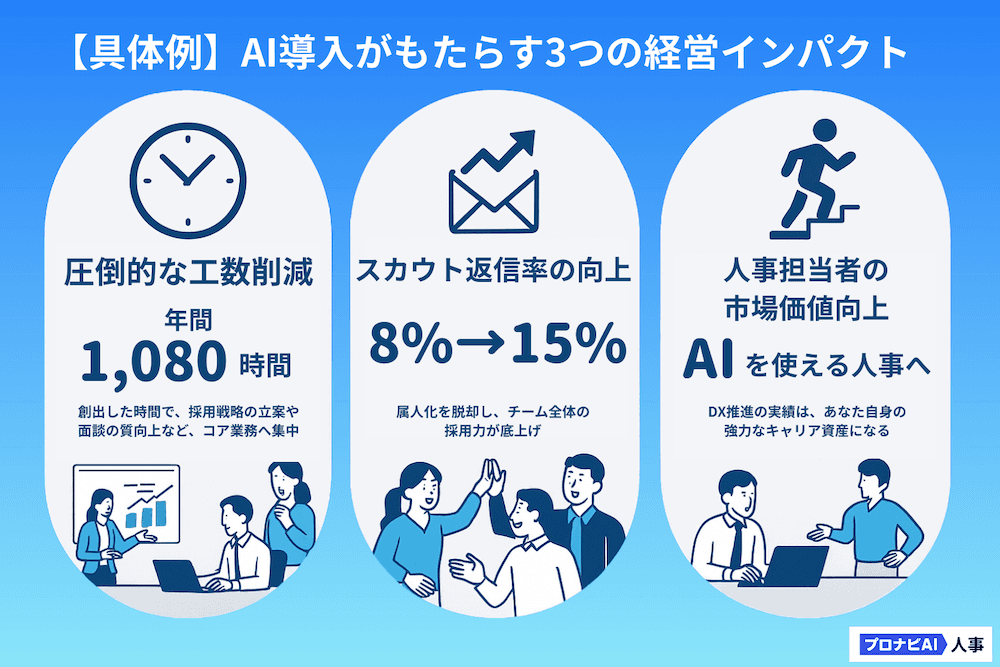 AIを活用して採用業務を効率化・高度化させた経験は、個人のスキルとしても大きな価値を持ちます。今後、人事業務においてもAI活用スキルは不可欠なものとなっていくでしょう。例えば、「AIを活用して採用プロセスを見直し、年間1,000時間以上の工数削減と返信率の倍増を実現した」という実績は、キャリアの強みとしてアピールできる内容です。業務改善の成果を数字で語れることは、社内外問わず信頼につながります。AI活用は、単なる業務効率化に留まらず、個人の成長やキャリア形成にもつながる取り組みなのです。